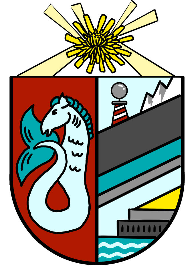 The coat of arms depicts both national animal and flower, as well as the flag colours and both new and old location.
